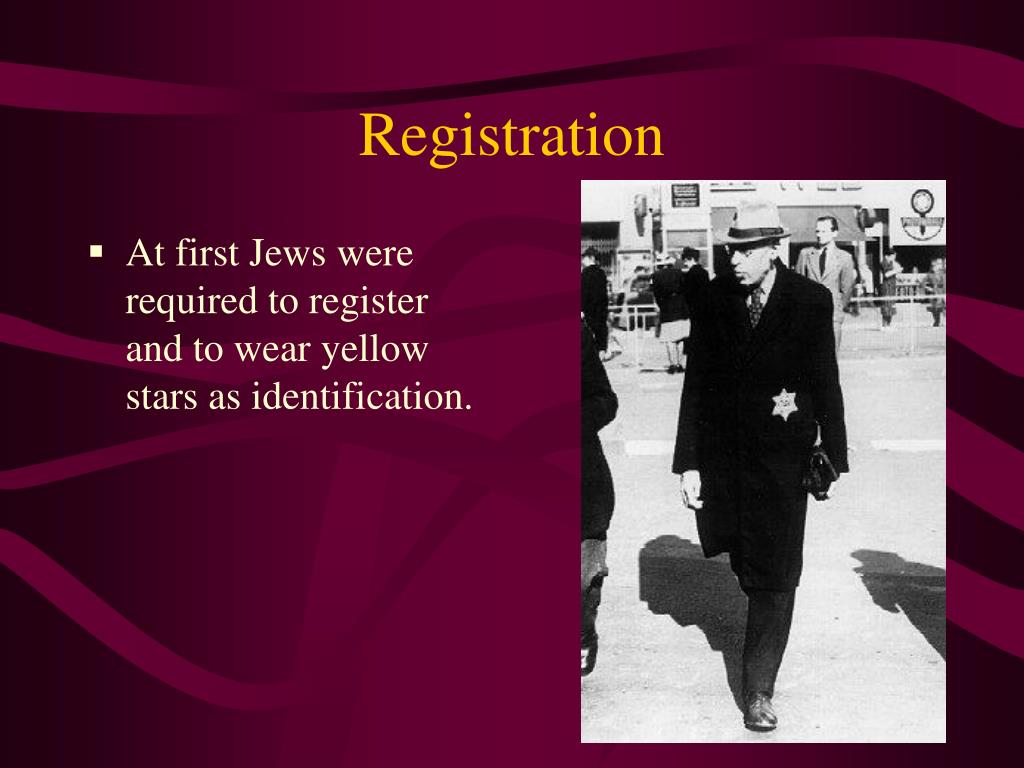 Registration • At first Jews were required to register and to wear yellow stars as identification.