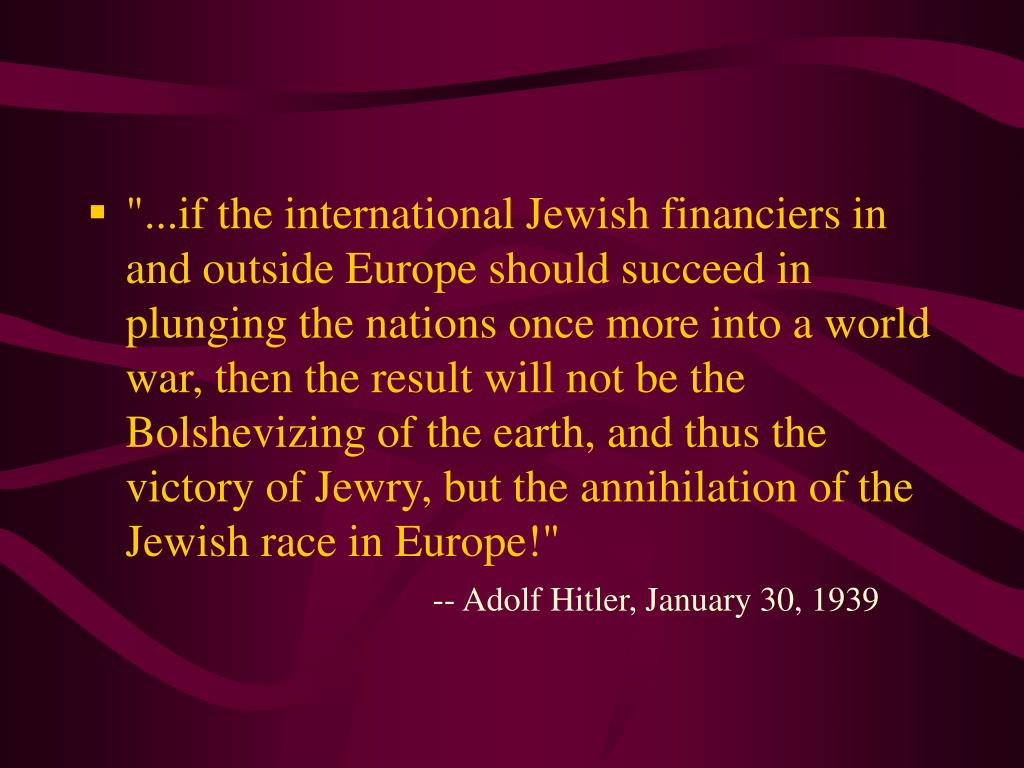 "...if the international Jewish financiers in and outside Europe should succeed in plunging the nations once more into a world war, then the result will not be the Bolshevizing of the earth, and thus the victory of Jewry, but the annihilation of the Jewish race in Europe!" -- Adolf Hitler, January 30, 1939