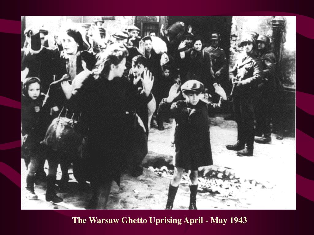 “Rise in Bloody Vengence” • The German propaganda minister, Joseph Goebbels, incited Germans to "rise in bloody vengeance against the Jews. • Mob violence broke out as the German police stood by and watched. • Storm troopers and members of the SS beat and murdered Jews along with the mobs. • Nearly 1000 synagogues were burned and thousands of Jews rounded up.