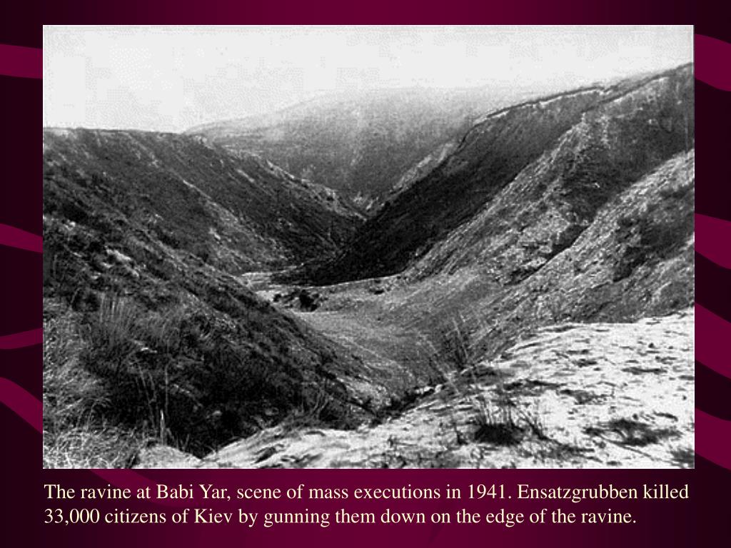 The ravine at Babi Yar, scene of mass executions in 1941. Ensatzgrubben killed 33,000 citizens of Kiev by gunning them down on the edge of the ravine.