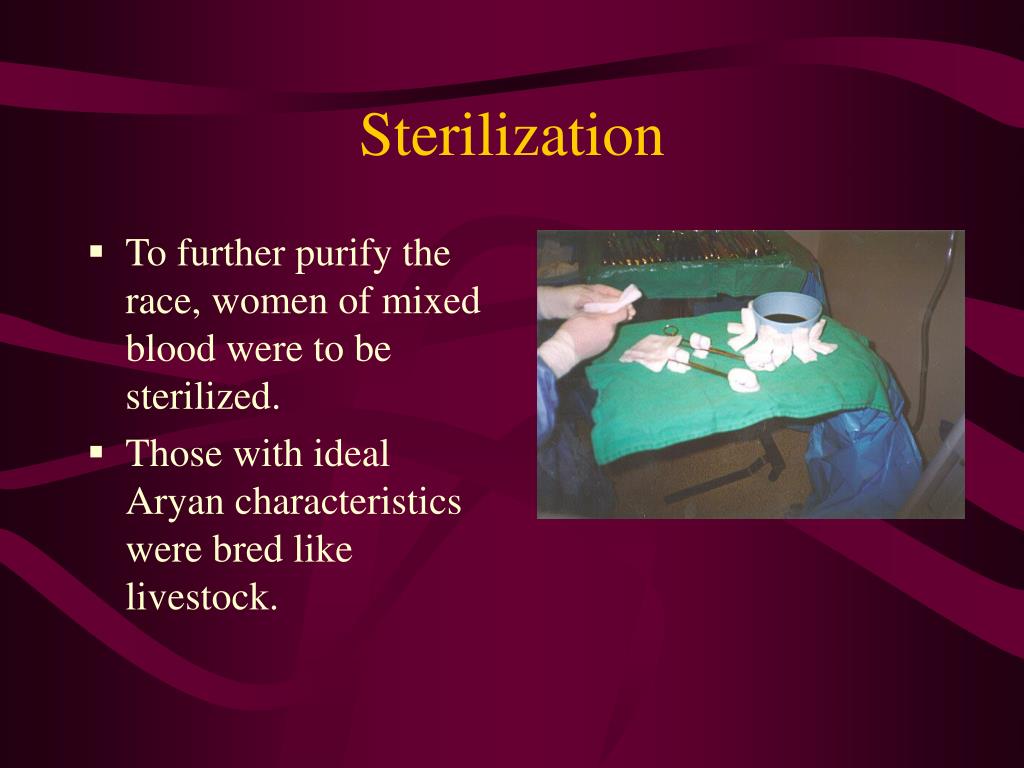Sterilization • To further purify the race, women of mixed blood were to be sterilized. • Those with ideal Aryan characteristics were bred like livestock.