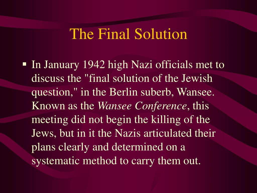 The Final Solution • In January 1942 high Nazi officials met to discuss the "final solution of the Jewish question," in the Berlin suberb, Wansee. Known as the Wansee Conference, this meeting did not begin the killing of the Jews, but in it the Nazis articulated their plans clearly and determined on a systematic method to carry them out.