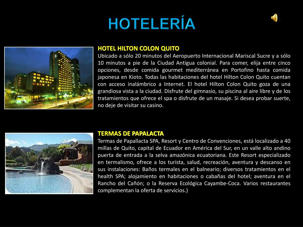 HOTELERÍA HOTEL HILTON COLON QUITO Ubicado a sólo 20 minutos del Aeropuerto Internacional Mariscal Sucre y a sólo 10 minutos a pie de la Ciudad Antigua colonial. Para comer, elija entre cinco opciones, desde comida gourmet mediterránea en Portofino hasta comida japonesa en Kioto. Todas las habitaciones del hotel Hilton Colon Quito cuentan con acceso inalámbrico a Internet. El hotel Hilton Colon Quito goza de una grandiosa vista a la ciudad. Disfrute del gimnasio, su piscina al aire libre y de los tratamientos que ofrece el spa o disfrute de un masaje. Si desea probar suerte, no deje de visitar su casino. TERMAS DE PAPALACTA Termas de Papallacta SPA, Resort y Centro de Convenciones, está localizado a 40 millas de Quito, capital de Ecuador en América del Sur, en un valle alto andino puerta de entrada a la selva amazónica ecuatoriana. Este Resort especializado en termalismo, ofrece a los turista, salud, recreación, aventura y descanso en sus instalaciones: Baños termales en el balneario; diversos tratamientos en el health SPA; alojamiento en habitaciones o cabañas del hotel; aventura en el Rancho del Cañón; o la Reserva Ecológica Cayambe-Coca. Varios restaurantes complementan la oferta de servicios.)