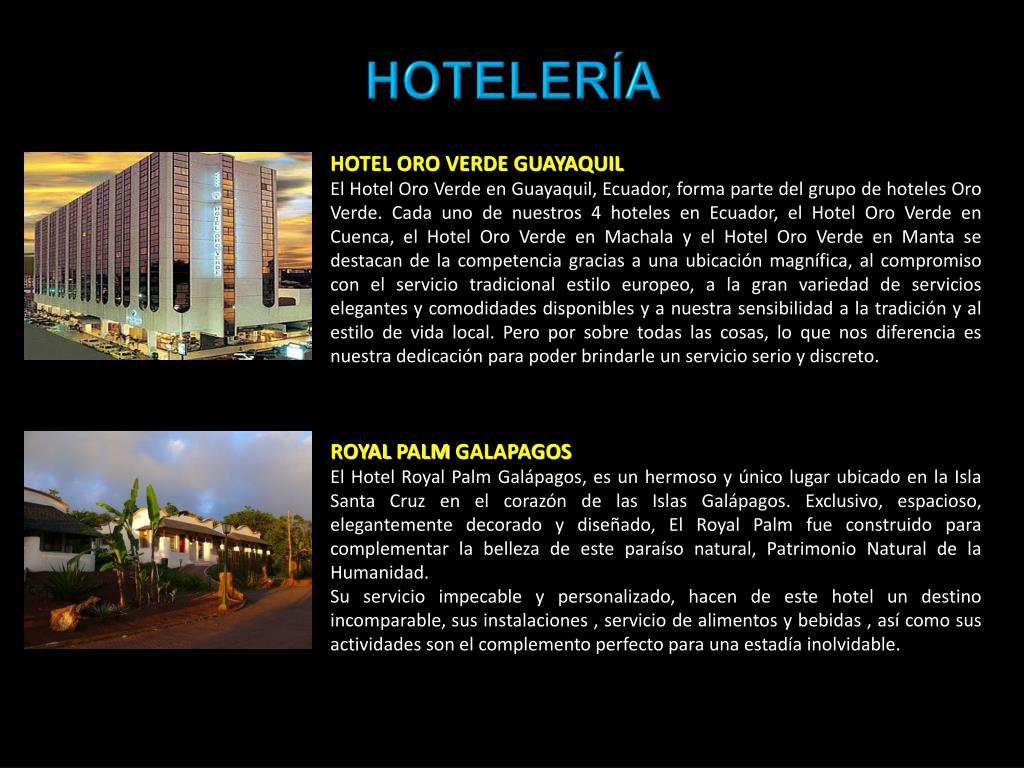 HOTELERÍA HOTEL ORO VERDE GUAYAQUIL El Hotel Oro Verde en Guayaquil, Ecuador, forma parte del grupo de hoteles Oro Verde. Cada uno de nuestros 4 hoteles en Ecuador, el Hotel Oro Verde en Cuenca, el Hotel Oro Verde en Machala y el Hotel Oro Verde en Manta se destacan de la competencia gracias a una ubicación magnífica, al compromiso con el servicio tradicional estilo europeo, a la gran variedad de servicios elegantes y comodidades disponibles y a nuestra sensibilidad a la tradición y al estilo de vida local. Pero por sobre todas las cosas, lo que nos diferencia es nuestra dedicación para poder brindarle un servicio serio y discreto. ROYAL PALM GALAPAGOS El Hotel Royal Palm Galápagos, es un hermoso y único lugar ubicado en la Isla Santa Cruz en el corazón de las Islas Galápagos. Exclusivo, espacioso, elegantemente decorado y diseñado, El Royal Palm fue construido para complementar la belleza de este paraíso natural, Patrimonio Natural de la Humanidad. Su servicio impecable y personalizado, hacen de este hotel un destino incomparable, sus instalaciones , servicio de alimentos y bebidas , así como sus actividades son el complemento perfecto para una estadía inolvidable.