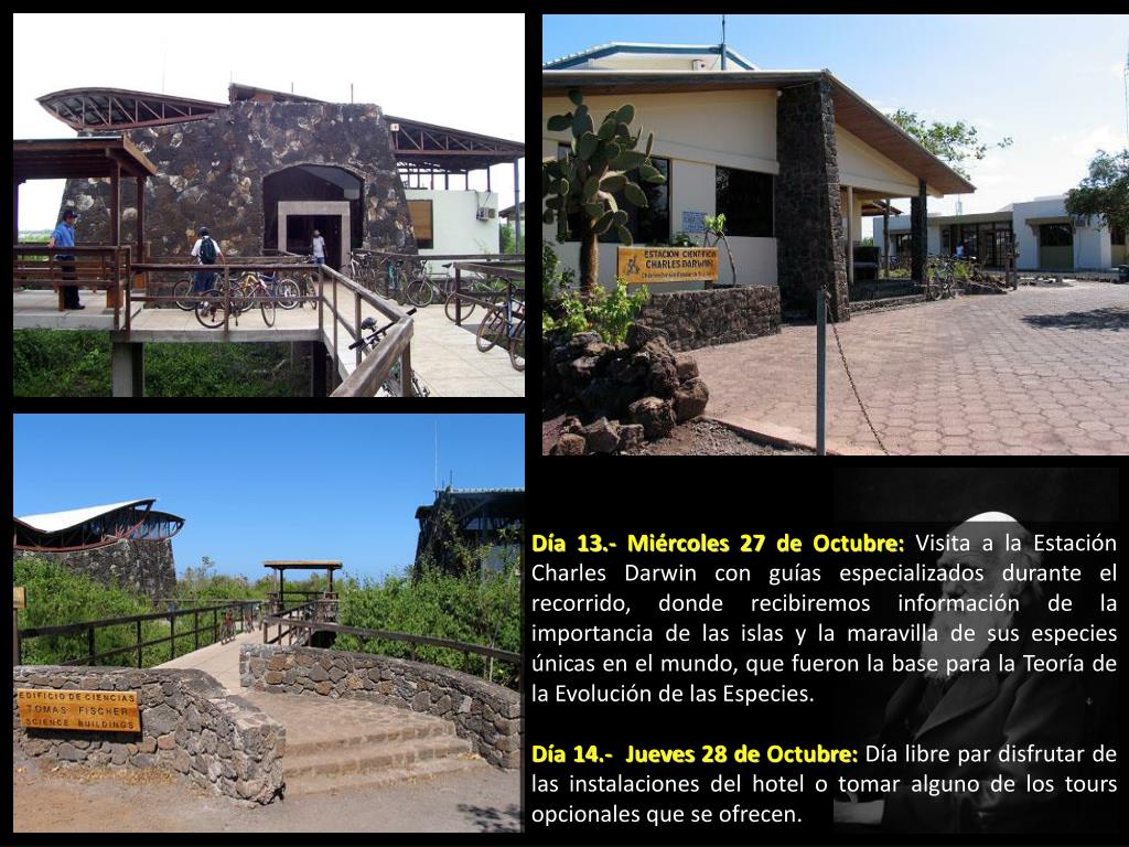 Día 13.- Miércoles 27 de Octubre: Visita a la Estación Charles Darwin con guías especializados durante el recorrido, donde recibiremos información de la importancia de las islas y la maravilla de sus especies únicas en el mundo, que fueron la base para la Teoría de la Evolución de las Especies. Día 14.- Jueves 28 de Octubre: Día libre par disfrutar de las instalaciones del hotel o tomar alguno de los tours opcionales que se ofrecen.
