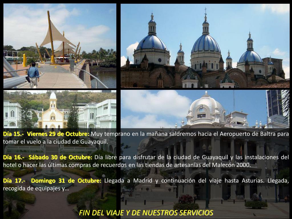 Día 15.- Viernes 29 de Octubre:Muy temprano en la mañana saldremos hacia el Aeropuerto de Baltra para tomar el vuelo a la ciudad de Guayaquil. Día 16.- Sábado 30 de Octubre: Día libre para disfrutar de la ciudad de Guayaquil y las instalaciones del hotel o hacer las últimas compras de recuerdos en las tiendas de artesanías del Malecón 2000. Día 17.- Domingo 31 de Octubre: Llegada a Madrid y continuación del viaje hasta Asturias. Llegada, recogida de equipajes y… FIN DEL VIAJE Y DE NUESTROS SERVICIOS