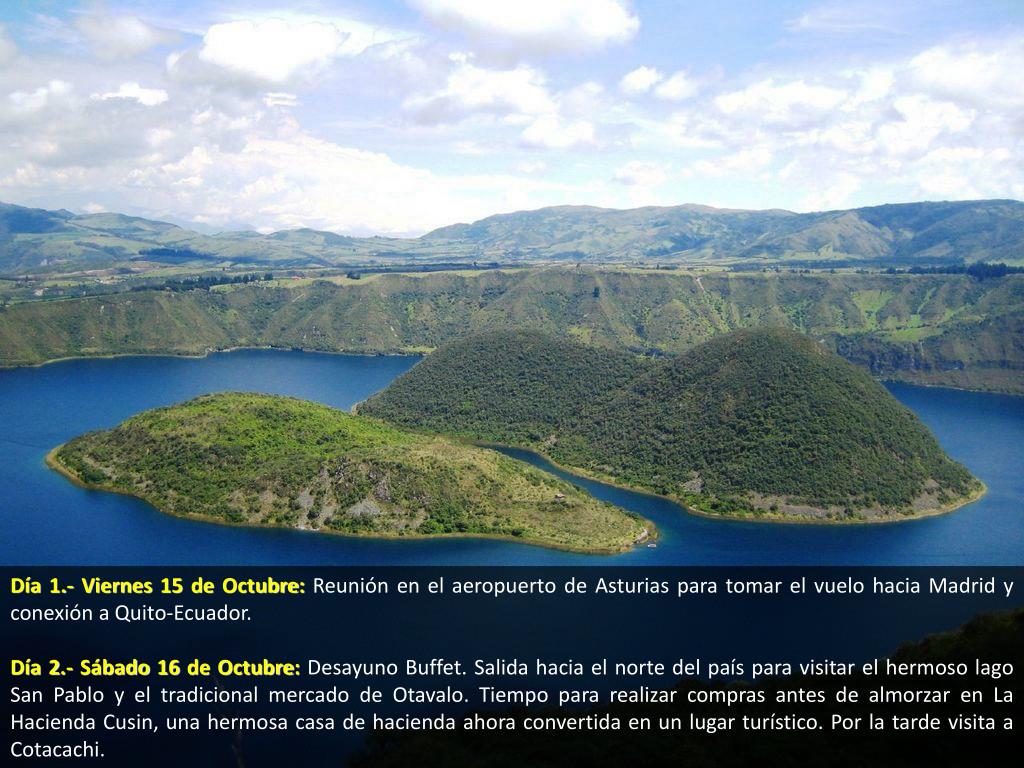 Día 1.- Viernes 15 de Octubre:Reunión en el aeropuerto de Asturias para tomar el vuelo hacia Madrid y conexión a Quito-Ecuador. Día 2.- Sábado 16 de Octubre:Desayuno Buffet. Salida hacia el norte del país para visitar el hermoso lago San Pablo y el tradicional mercado de Otavalo. Tiempo para realizar compras antes de almorzar en La Hacienda Cusin, una hermosa casa de hacienda ahora convertida en un lugar turístico. Por la tarde visita a Cotacachi.