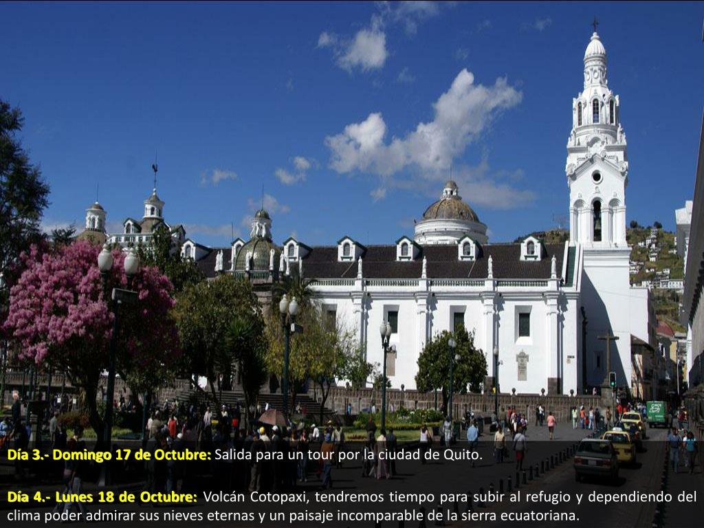 Día 3.- Domingo 17 de Octubre: Salida para un tour por la ciudad de Quito. Día 4.- Lunes 18 de Octubre:Volcán Cotopaxi, tendremos tiempo para subir al refugio y dependiendo del clima poder admirar sus nieves eternas y un paisaje incomparable de la sierra ecuatoriana.