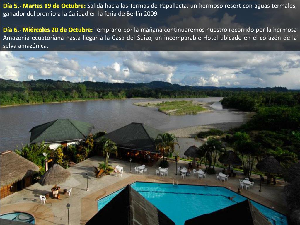 Día 5.- Martes 19 de Octubre:Salida hacia las Termas de Papallacta, un hermoso resort con aguas termales, ganador del premio a la Calidad en la feria de Berlín 2009. Día 6.- Miércoles 20 de Octubre: Temprano por la mañana continuaremos nuestro recorrido por la hermosa Amazonía ecuatoriana hasta llegar a la Casa del Suizo, un incomparable Hotel ubicado en el corazón de la selva amazónica.