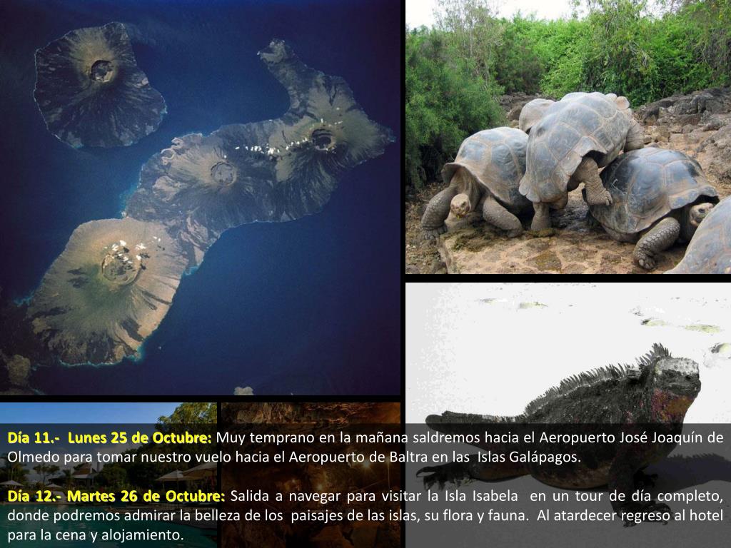 Día 11.- Lunes 25 de Octubre: Muy temprano en la mañana saldremos hacia el Aeropuerto José Joaquín de Olmedo para tomar nuestro vuelo hacia el Aeropuerto de Baltra en las Islas Galápagos. Día 12.- Martes 26 de Octubre: Salida a navegar para visitar la Isla Isabela en un tour de día completo, donde podremos admirar la belleza de los paisajes de las islas, su flora y fauna. Al atardecer regreso al hotel para la cena y alojamiento.