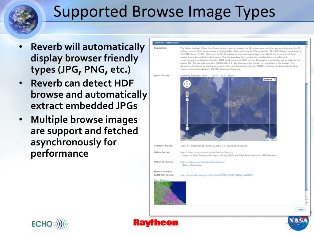 Supported Browse Image Types • Reverb will automaticallydisplay browser friendly types (JPG, PNG, etc.) • Reverb can detect HDFbrowse and automatically extract embedded JPGs • Multiple browse images are support and fetched asynchronously for performance