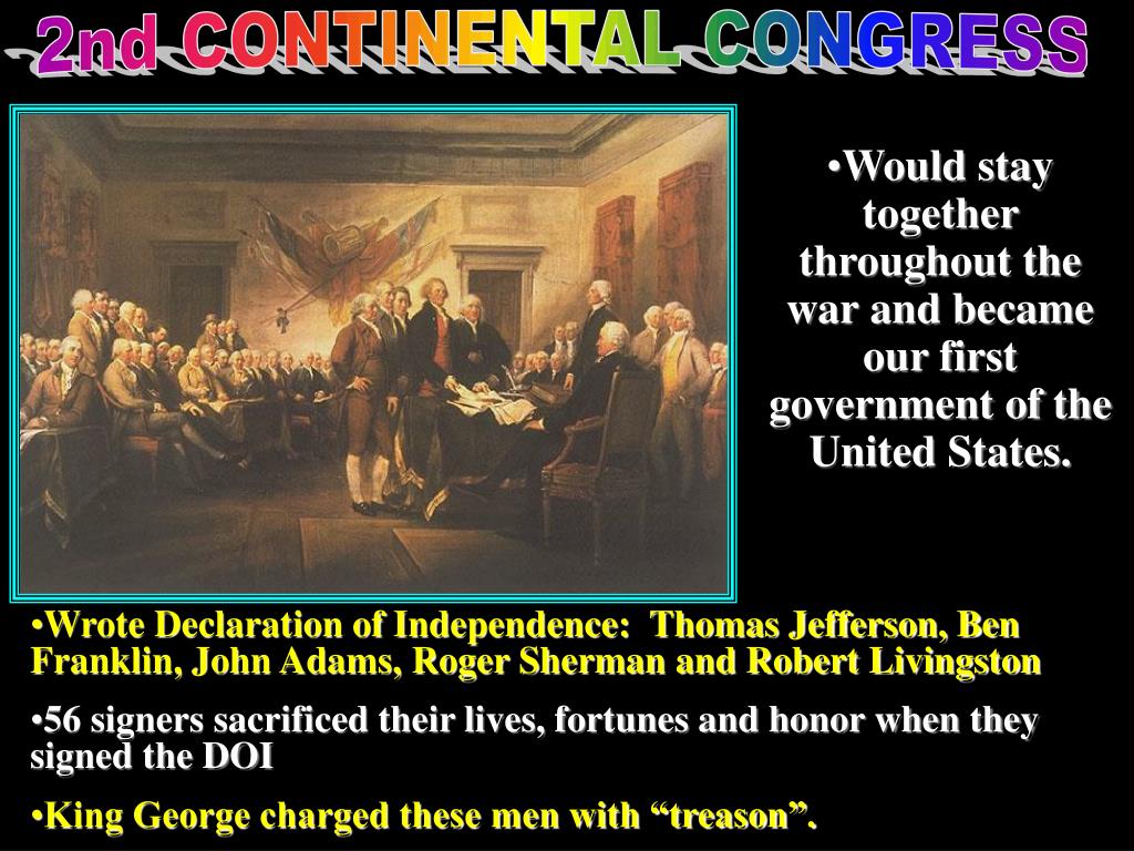 DOI-2 2nd CONTINENTAL CONGRESS • Would stay together throughout the war and became our first government of the United States. • Wrote Declaration of Independence: Thomas Jefferson, Ben Franklin, John Adams, Roger Sherman and Robert Livingston • 56 signers sacrificed their lives, fortunes and honor when they signed the DOI • King George charged these men with “treason”.