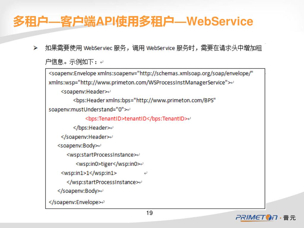多租户—简介 • 云流程平台典型特征 • 开发期单租户、运行期多租户 • 租户间流程数据完全隔离 • 租户间组织机构、权限完全隔离 • 支持多租户共享一个数据源 • 支持不同租户绑定不同数据源 • Work Space、Client按照租户登陆 • 完全兼容BPS6.6版本中的API接口