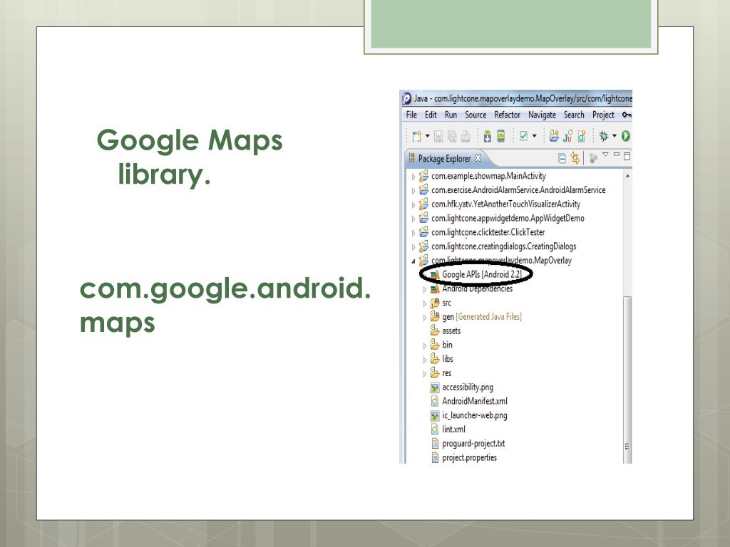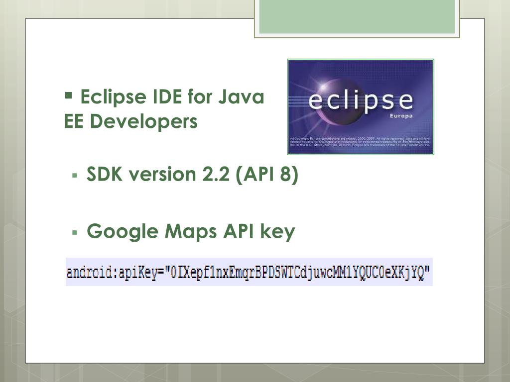Eclipse IDE for Java EE Developers • SDK version 2.2 (API 8) • Google Maps API key