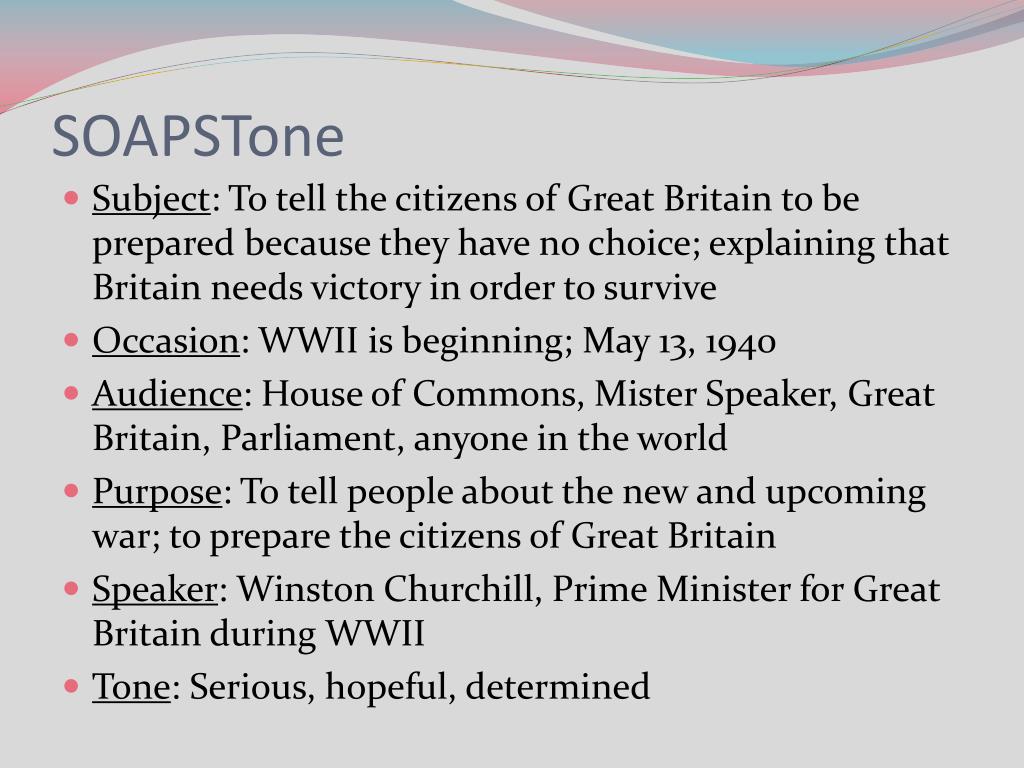 SOAPSTone • Subject: To tell the citizens of Great Britain to be prepared because they have no choice; explaining that Britain needs victory in order to survive • Occasion: WWII is beginning; May 13, 1940 • Audience: House of Commons, Mister Speaker, Great Britain, Parliament, anyone in the world • Purpose: To tell people about the new and upcoming war; to prepare the citizens of Great Britain • Speaker: Winston Churchill, Prime Minister for Great Britain during WWII • Tone: Serious, hopeful, determined