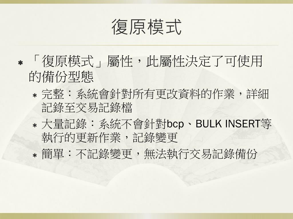復原模式 • 「復原模式」屬性,此屬性決定了可使用的備份型態 • 完整:系統會針對所有更改資料的作業,詳細記錄至交易記錄檔 • 大量記錄:系統不會針對bcp、BULK INSERT等執行的更新作業,記錄變更 • 簡單:不記錄變更,無法執行交易記錄備份