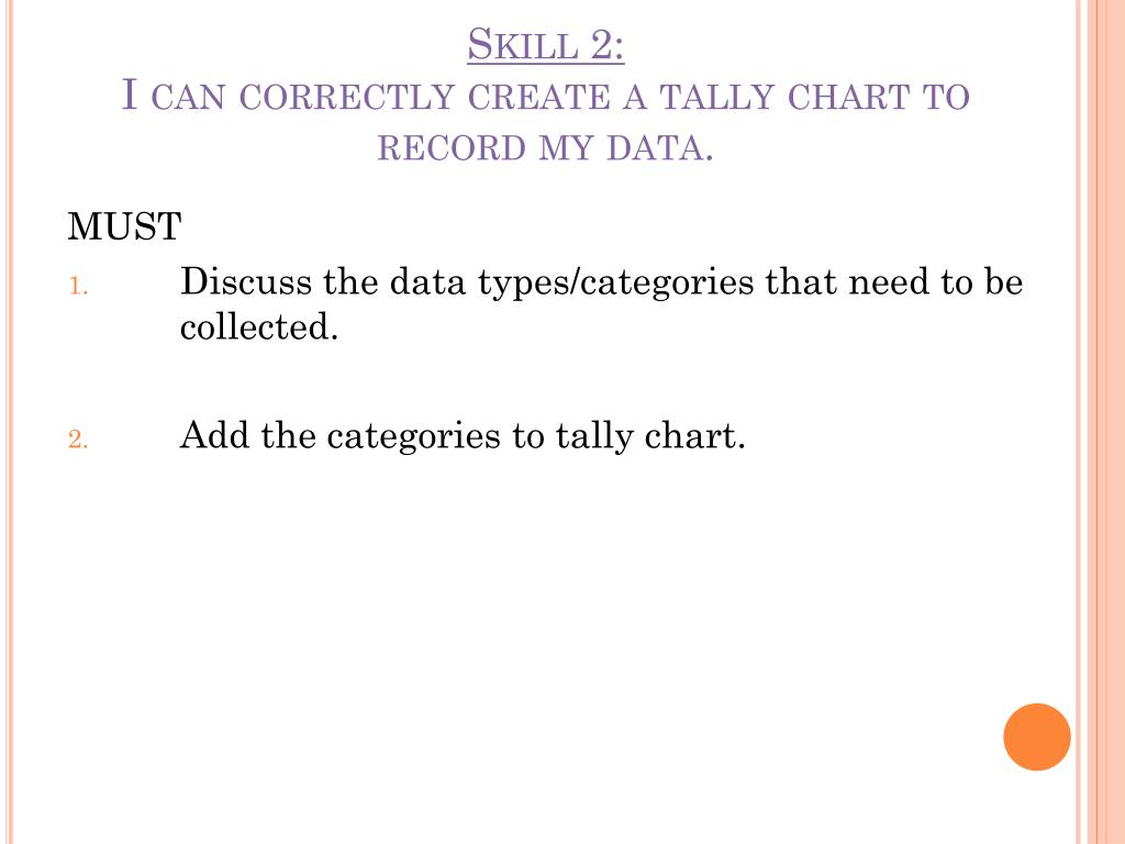 Skill 2:I can correctly create a tally chart to record my data. MUST • Discuss the data types/categories that need to be collected. • Add the categories to tally chart.