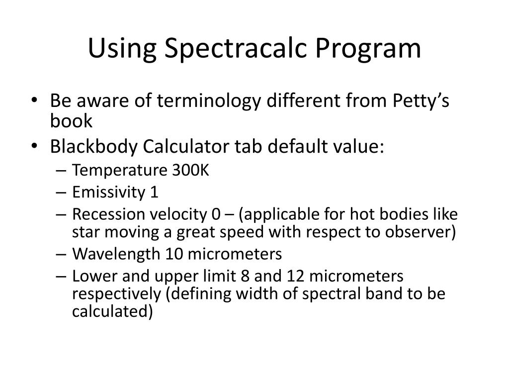 Metr 415/715. Wednesday February 27 2013. Using Spectracalc Program. Be aware of terminology different from Petty’s book Blackbody Calculator tab default value: Temperature 300K Emissivity 1