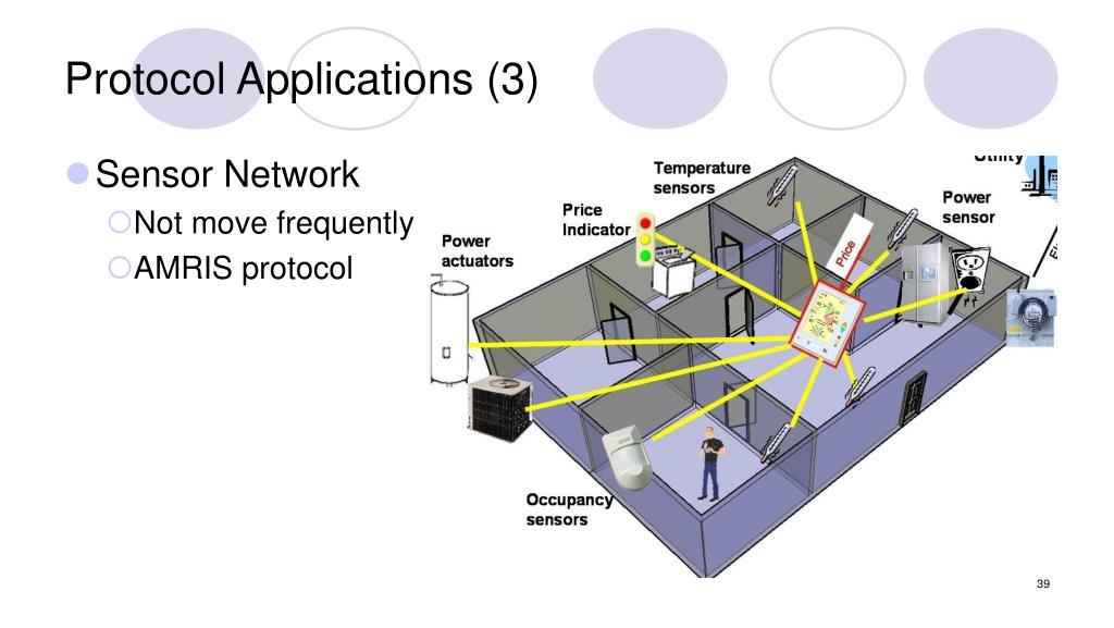 Protocol Applications (3) • Sensor Network • Not move frequently • AMRIS protocol