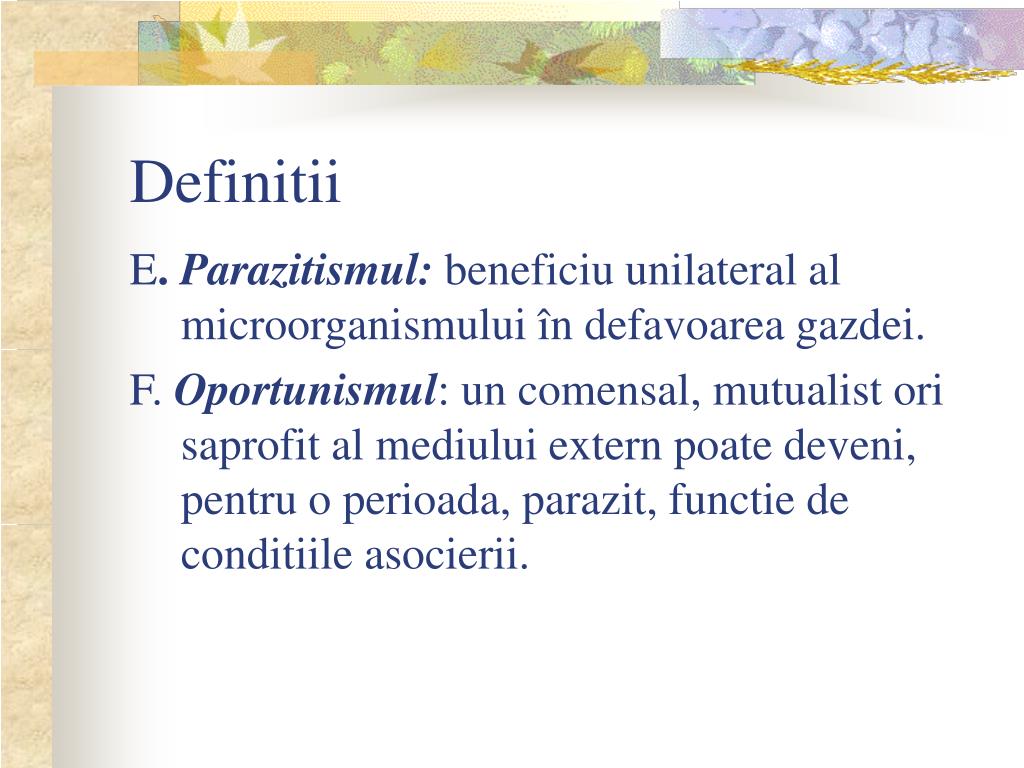 Definitii E. Parazitismul:beneficiu unilateral al microorganismului în defavoarea gazdei. F. Oportunismul: un comensal, mutualist ori saprofit al mediului extern poate deveni, pentru o perioada, parazit, functie de conditiile asocierii.