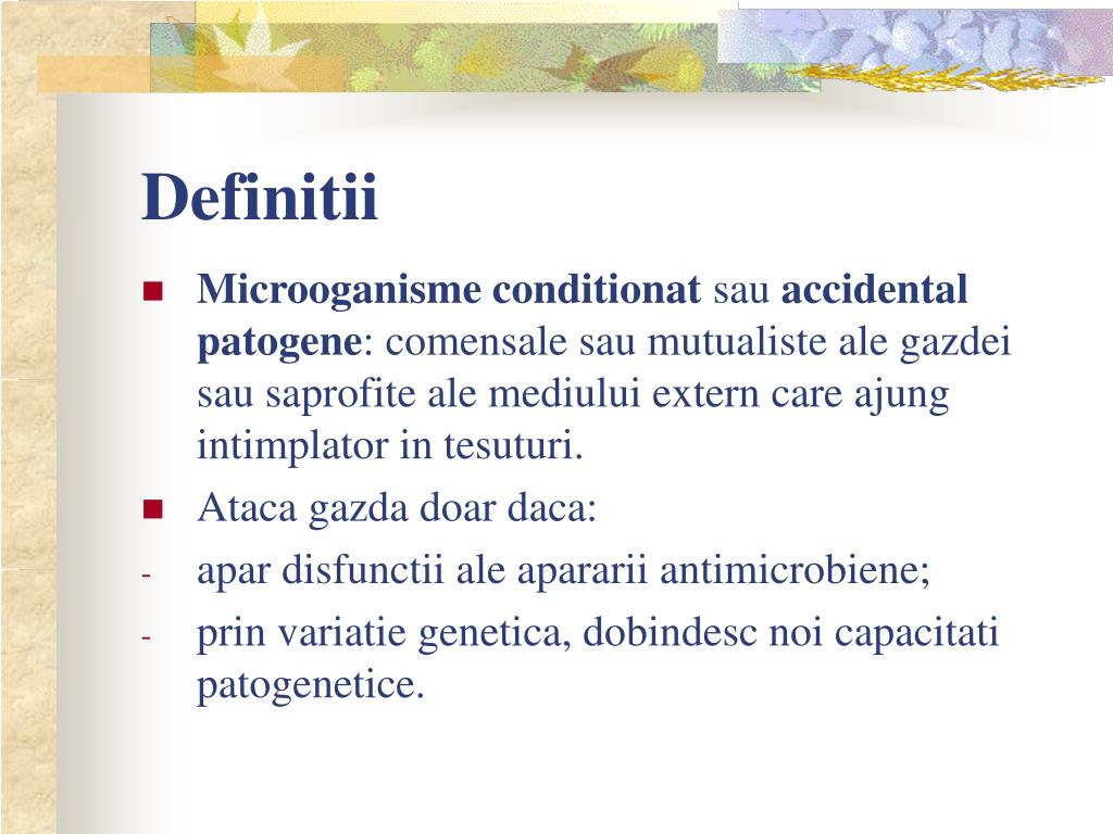 Definitii • Microoganisme conditionat sau accidental patogene: comensale sau mutualiste ale gazdei sau saprofite ale mediului extern care ajung intimplator in tesuturi. • Ataca gazda doar daca: • apar disfunctii ale apararii antimicrobiene; • prin variatie genetica, dobindesc noi capacitati patogenetice.