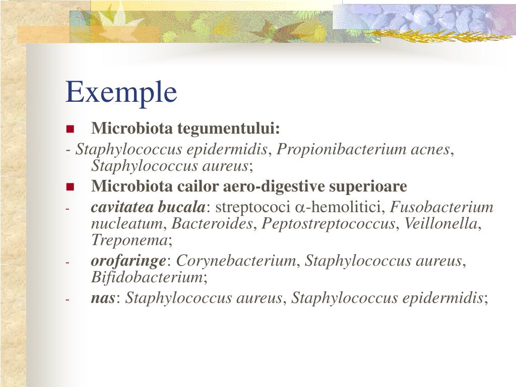 Exemple • Microbiota tegumentului: - Staphylococcus epidermidis, Propionibacterium acnes, Staphylococcus aureus; • Microbiota cailor aero-digestive superioare • cavitatea bucala: streptococi -hemolitici, Fusobacterium nucleatum, Bacteroides, Peptostreptococcus, Veillonella, Treponema; • orofaringe: Corynebacterium, Staphylococcus aureus, Bifidobacterium; • nas:Staphylococcus aureus, Staphylococcus epidermidis;