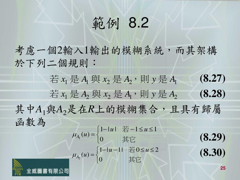 範例 8.2 考慮一個2輸入1輸出的模糊系統,而其架構於下列二個規則: (8.27) (8.28) 其中A1與A2是在R上的模糊集合,且具有歸屬函數為 (8.29) (8.30)