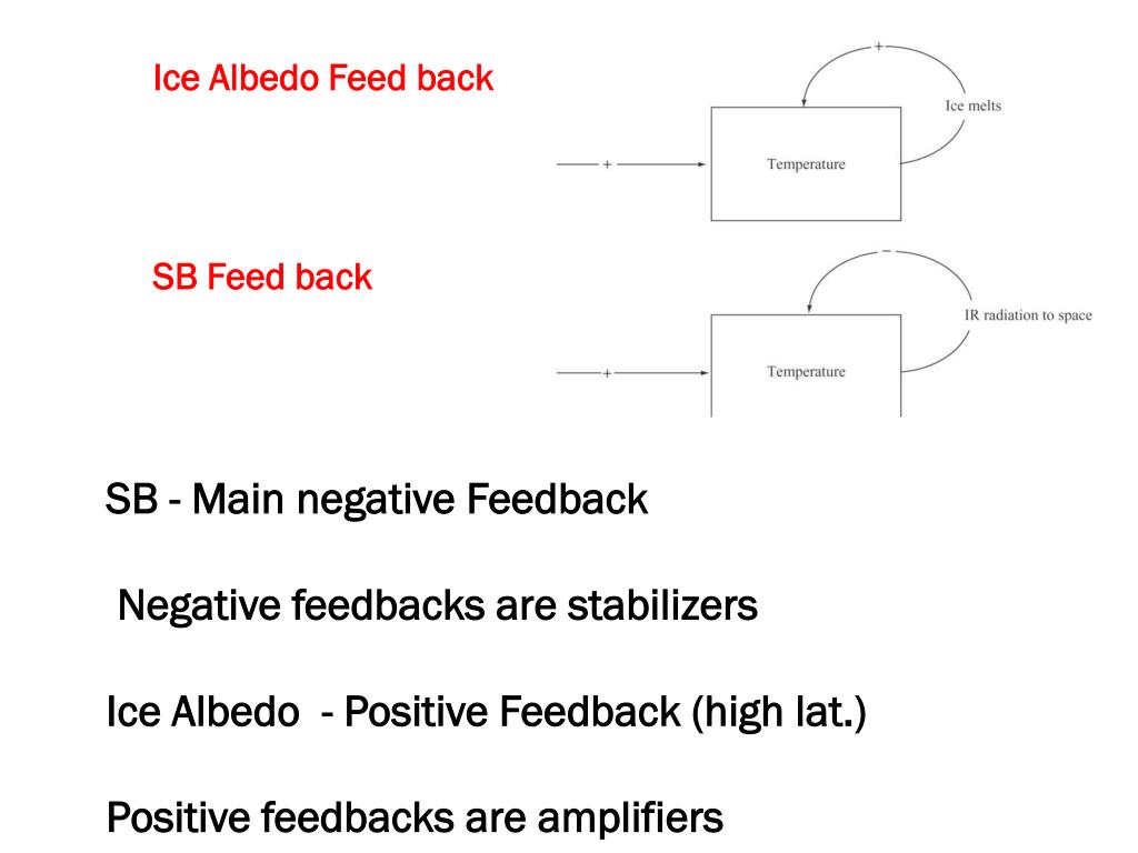 Ice Albedo Feed back SB Feed back SB d SB - Main negative Feedback Negative feedbacks are stabilizers Ice Albedo - Positive Feedback (high lat.) Positive feedbacks are amplifiers 7.1d: Water Vapor Feed back c 7.1c: Hydrologic Cycle Feed back