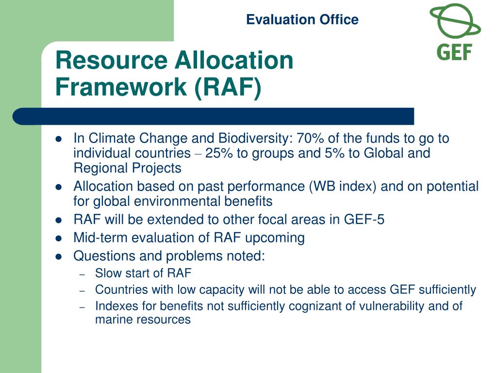 Resource Allocation Framework (RAF) • In Climate Change and Biodiversity: 70% of the funds to go to individual countries – 25% to groups and 5% to Global and Regional Projects • Allocation based on past performance (WB index) and on potential for global environmental benefits • RAF will be extended to other focal areas in GEF-5 • Mid-term evaluation of RAF upcoming • Questions and problems noted: • Slow start of RAF • Countries with low capacity will not be able to access GEF sufficiently • Indexes for benefits not sufficiently cognizant of vulnerability and of marine resources