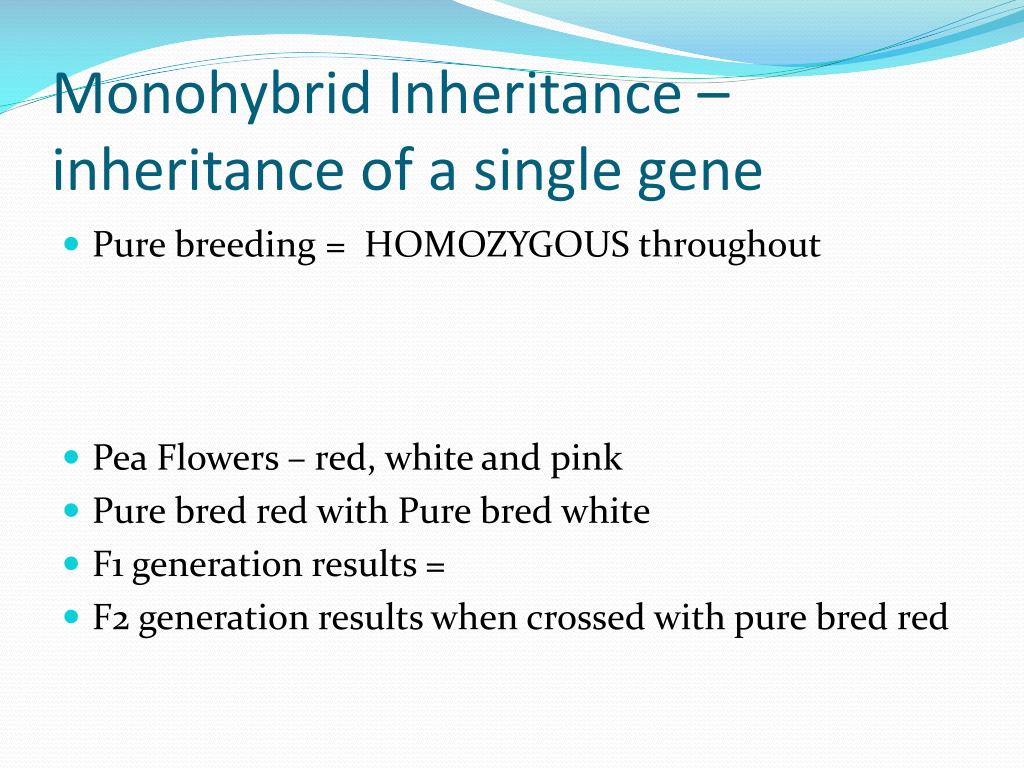 Monohybrid Inheritance – inheritance of a single gene • Pure breeding = HOMOZYGOUS throughout • Pea Flowers – red, white and pink • Pure bred red with Pure bred white • F1 generation results = • F2 generation results when crossed with pure bred red