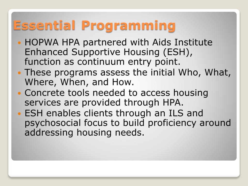 HOPWA HPA partnered with Aids Institute Enhanced Supportive Housing (ESH), function as continuum entry point. • These programs assess the initial Who, What, Where, When, and How. • Concrete tools needed to access housing services are provided through HPA. • ESH enables clients through an ILS and psychosocial focus to build proficiency around addressing housing needs. EssentialProgramming