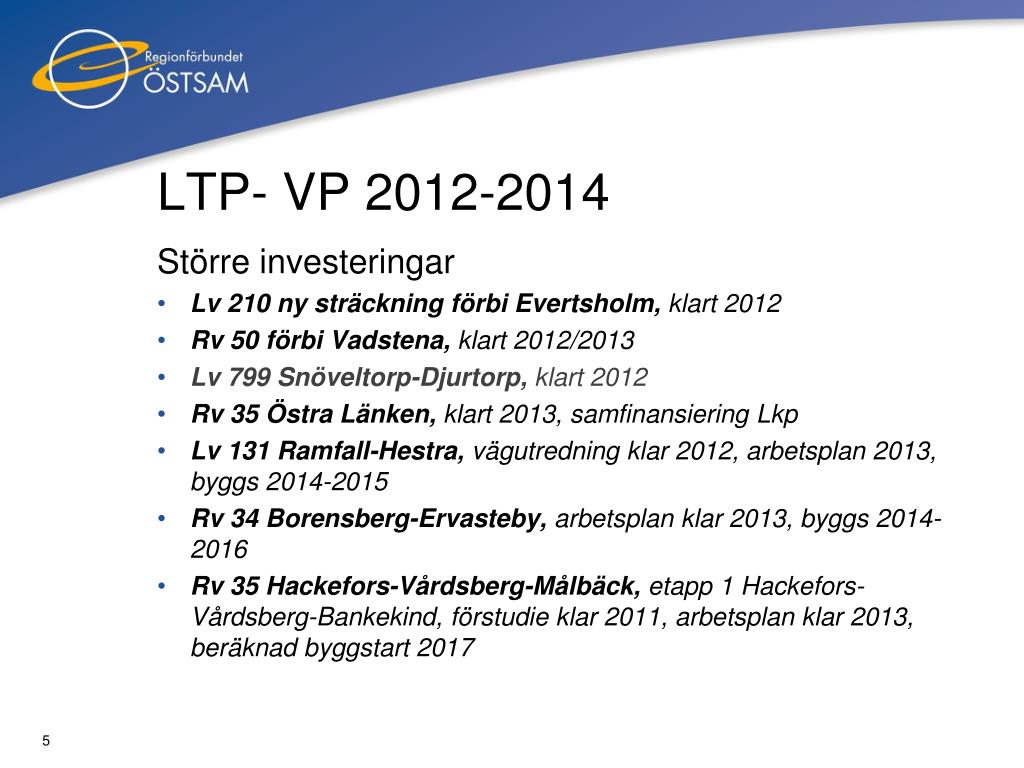 LTP- preliminär VP 2012-2014 Större investeringar • Lv 206 Skänninge-Vadstena, förstudie 2013, arbetsplan 2015, byggstart 2018 • Rv 35/Lv 757 Vårdsberg-E4 delen förbi Linghem, förstudie 2013, arbetsplan 2015, byggstart 2018 • Rv 35 Vårdsberg-Målbäck, etapp 2 delen Bankekind-Målbäck, oklart när • Rv 23 förbi Kisa, oklart när • Rv 51 förbi Finspång, oklart när