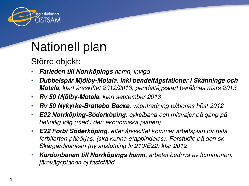 Nationell plan Större objekt: • Farleden till Norrköpings hamn, invigd • Dubbelspår Mjölby-Motala, inkl pendeltågstationer i Skänninge och Motala, klart årsskiftet 2012/2013, pendeltågsstart beräknas mars 2013 • Rv 50 Mjölby-Motala, klart september 2013 • Rv 50 Nykyrka-Brattebo Backe, vägutredning påbörjas höst 2012 • E22 Norrköping-Söderköping, cykelbana och mittvajer på gång på befintlig väg (med i den ekonomiska planen) • E22 Förbi Söderköping, efter årsskiftet kommer arbetsplan för hela förbifarten påbörjas, (ska kunna etappindelas). Förstudie på den sk Skärgårdslänken (ny anslutning lv 210/E22) klar 2012 • Kardonbanan till Norrköpings hamn, arbetet bedrivs av kommunen, järnvägsplanen ej fastställd