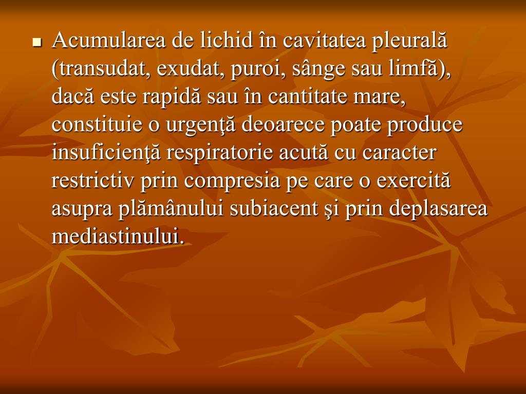 Acumularea de lichid în cavitatea pleurală (transudat, exudat, puroi, sânge sau limfă), dacă este rapidă sau în cantitate mare, constituie o urgenţă deoarece poate produce insuficienţă respiratorie acută cu caracter restrictiv prin compresia pe care o exercită asupra plămânului subiacent şi prin deplasarea mediastinului.