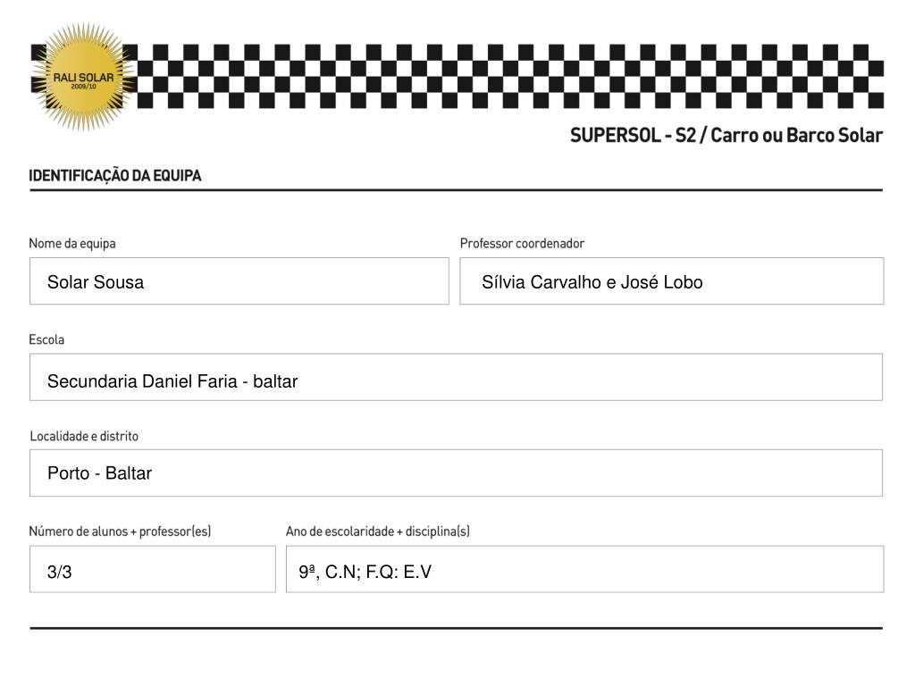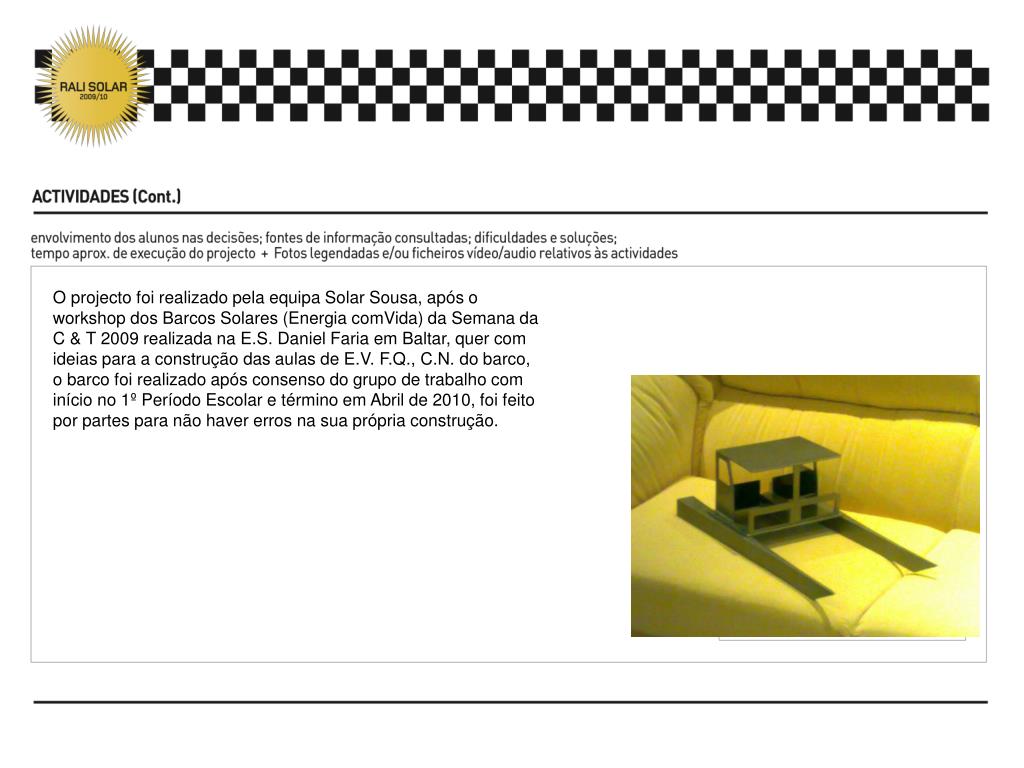 O projecto foi realizado pela equipa Solar Sousa, após o workshop dos Barcos Solares (Energia comVida) da Semana da C & T 2009 realizada na E.S. Daniel Faria em Baltar, quer com ideias para a construção das aulas de E.V. F.Q., C.N. do barco, o barco foi realizado após consenso do grupo de trabalho com início no 1º Período Escolar e término em Abril de 2010, foi feito por partes para não haver erros na sua própria construção.