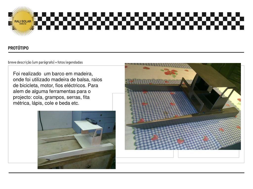 Foi realizado um barco em madeira, onde foi utilizado madeira de balsa, raios de bicicleta, motor, fios eléctricos. Para alem de alguma ferramentas para o projecto: cola, grampos, serras, fita métrica, lápis, cole e beda etc.
