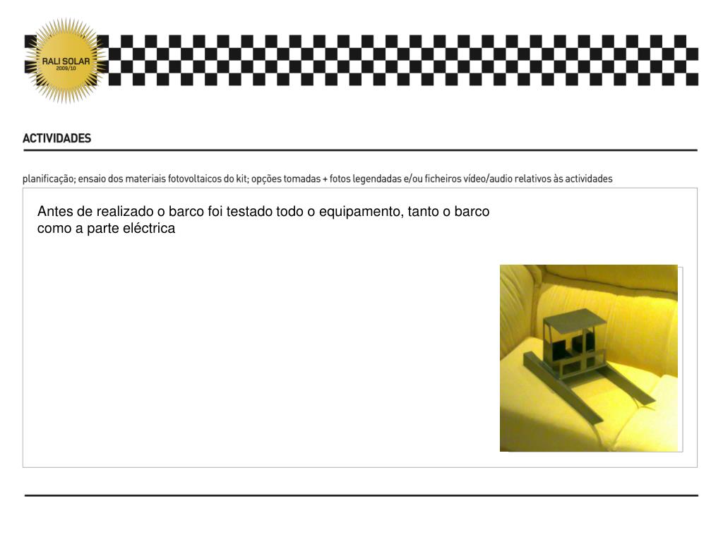 Antes de realizado o barco foi testado todo o equipamento, tanto o barco como a parte eléctrica