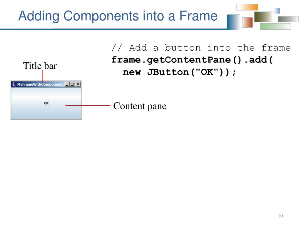 Content Pane Delegation // Add a button into the frame frame.getContentPane().add( new JButton("OK")); Title bar // Add a button into the frame frame.add( new JButton("OK")); Content pane