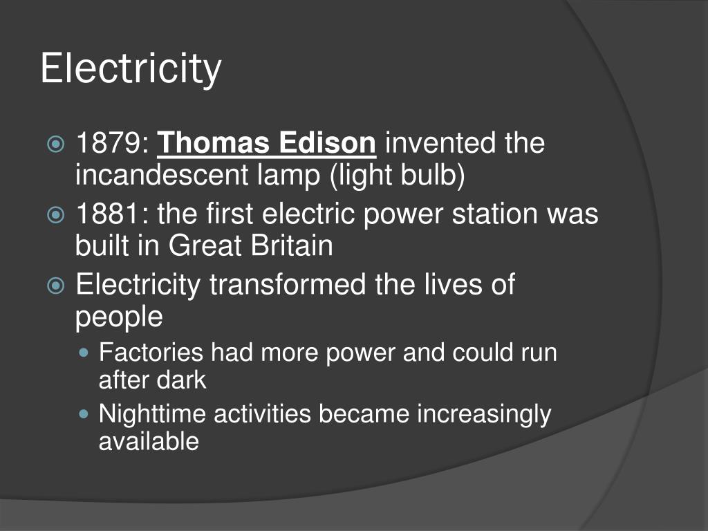 Electricity • 1879: Thomas Edison invented the incandescent lamp (light bulb) • 1881: the first electric power station was built in Great Britain • Electricity transformed the lives of people • Factories had more power and could run after dark • Nighttime activities became increasingly available