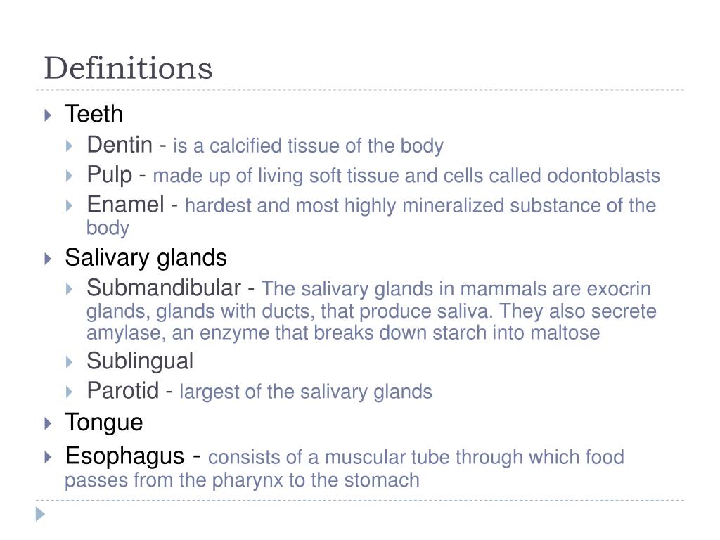 Definitions • Teeth • Dentin - is a calcified tissue of the body • Pulp - made up of living soft tissue and cells called odontoblasts • Enamel - hardest and most highly mineralized substance of the body • Salivary glands • Submandibular - The salivary glands in mammals are exocrin glands, glands with ducts, that produce saliva. They also secrete amylase, an enzyme that breaks down starch into maltose • Sublingual • Parotid - largest of the salivary glands • Tongue • Esophagus - consists of a muscular tube through which food passes from the pharynx to the stomach