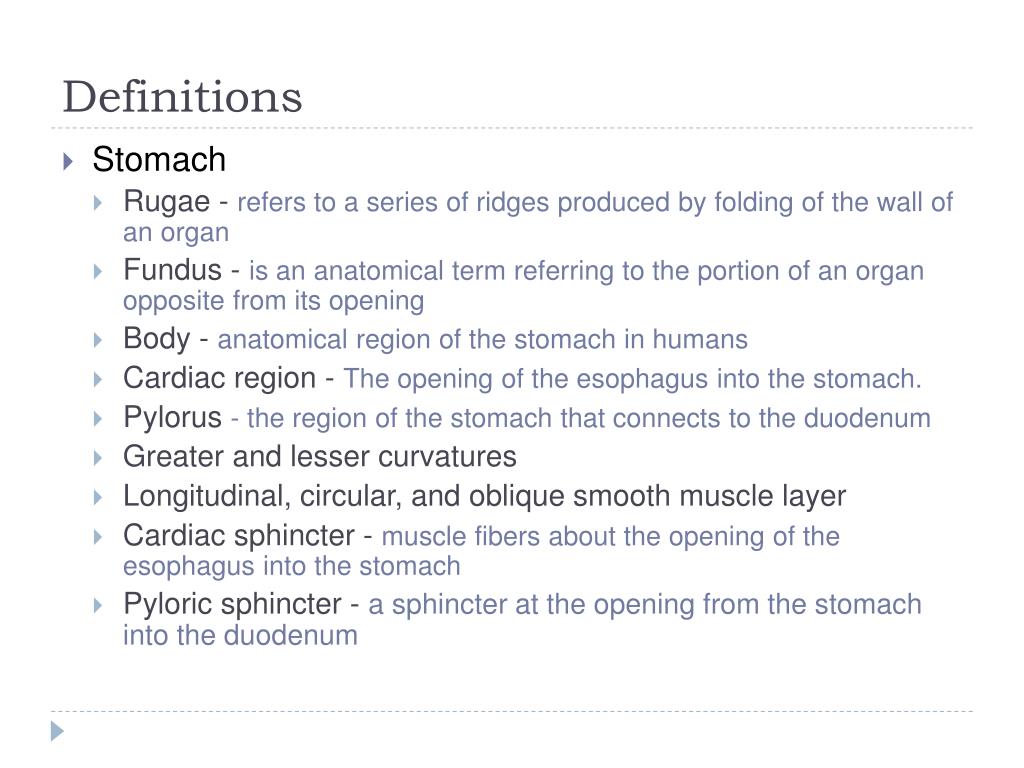 Definitions • Stomach • Rugae - refers to a series of ridges produced by folding of the wall of an organ • Fundus - is an anatomical term referring to the portion of an organ opposite from its opening • Body - anatomical region of the stomach in humans • Cardiac region - The opening of the esophagus into the stomach. • Pylorus - the region of the stomach that connects to the duodenum • Greater and lesser curvatures • Longitudinal, circular, and oblique smooth muscle layer • Cardiac sphincter - muscle fibers about the opening of the esophagus into the stomach • Pyloric sphincter - a sphincter at the opening from the stomach into the duodenum