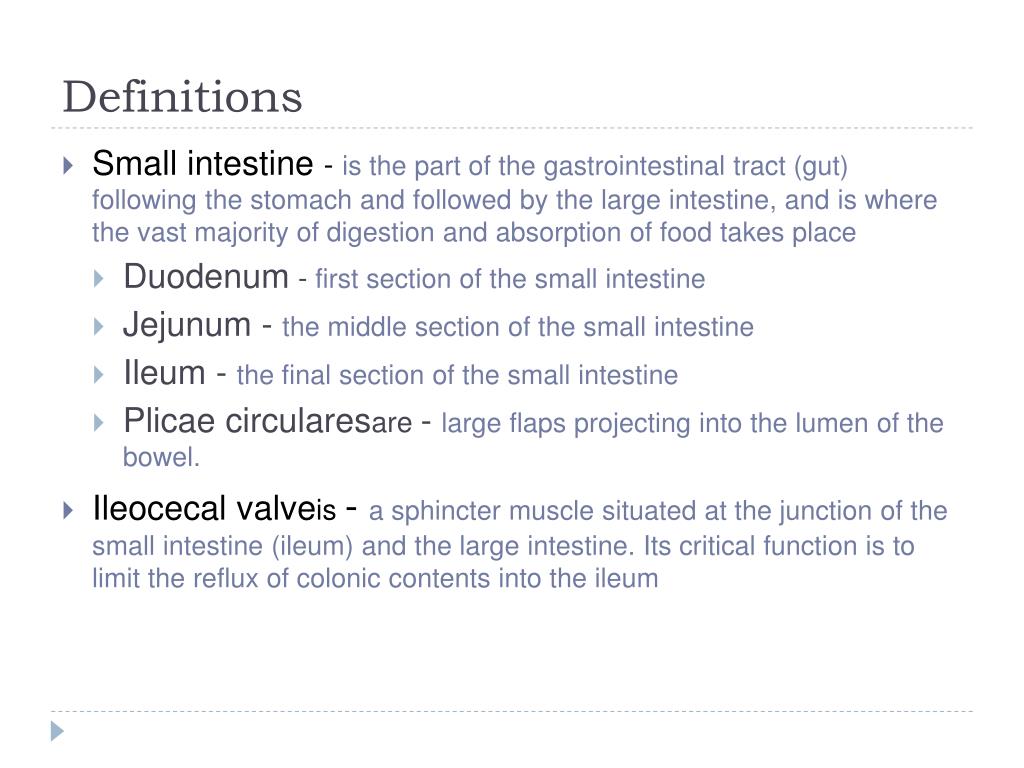 Definitions • Small intestine - is the part of the gastrointestinal tract (gut) following the stomach and followed by the large intestine, and is where the vast majority of digestion and absorption of food takes place • Duodenum - first section of the small intestine • Jejunum - the middle section of the small intestine • Ileum - the final section of the small intestine • Plicaecircularesare- large flaps projecting into the lumen of the bowel. • Ileocecalvalveis-a sphincter muscle situated at the junction of the small intestine (ileum) and the large intestine. Its critical function is to limit the reflux of colonic contents into the ileum