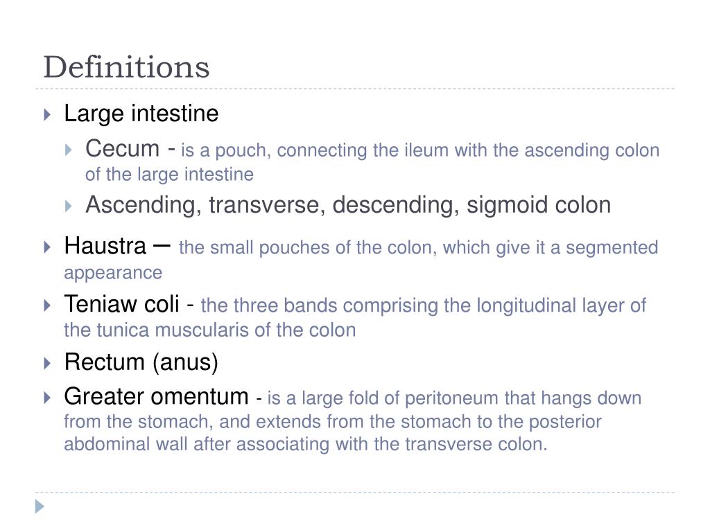 Definitions • Large intestine • Cecum -is a pouch, connecting the ileum with the ascending colon of the large intestine • Ascending, transverse, descending, sigmoid colon • Haustra– the small pouches of the colon, which give it a segmented appearance • Teniaw coli - the three bands comprising the longitudinal layer of the tunica muscularis of the colon • Rectum (anus) • Greater omentum- is a large fold of peritoneum that hangs down from the stomach, and extends from the stomach to the posterior abdominal wall after associating with the transverse colon.