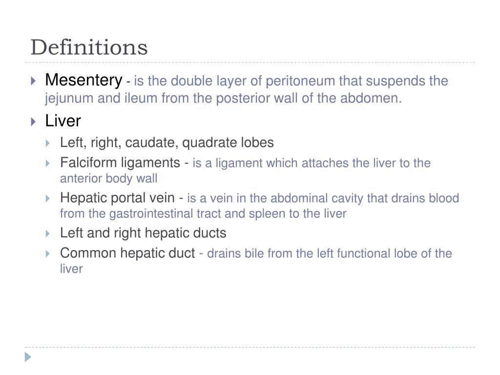Definitions • Mesentery - is the double layer of peritoneum that suspends the jejunum and ileum from the posterior wall of the abdomen. • Liver • Left, right, caudate, quadrate lobes • Falciform ligaments - is a ligament which attaches the liver to the anterior body wall • Hepatic portal vein - is a vein in the abdominal cavity that drains blood from the gastrointestinal tract and spleen to the liver • Left and right hepatic ducts • Common hepatic duct - drains bile from the left functional lobe of the liver
