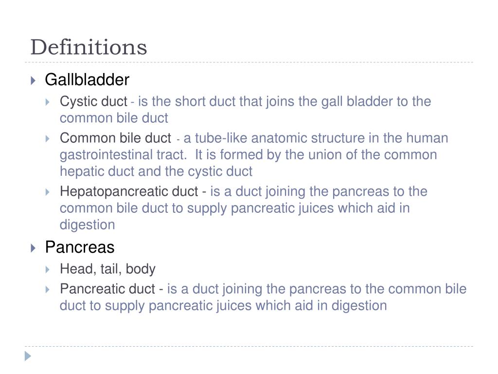Definitions • Gallbladder • Cystic duct- is the short duct that joins the gall bladder to the common bile duct • Common bile duct - a tube-like anatomic structure in the human gastrointestinal tract. It is formed by the union of the common hepatic duct and the cystic duct • Hepatopancreatic duct - is a duct joining the pancreas to the common bile duct to supply pancreatic juices which aid in digestion • Pancreas • Head, tail, body • Pancreatic duct - is a duct joining the pancreas to the common bile duct to supply pancreatic juices which aid in digestion