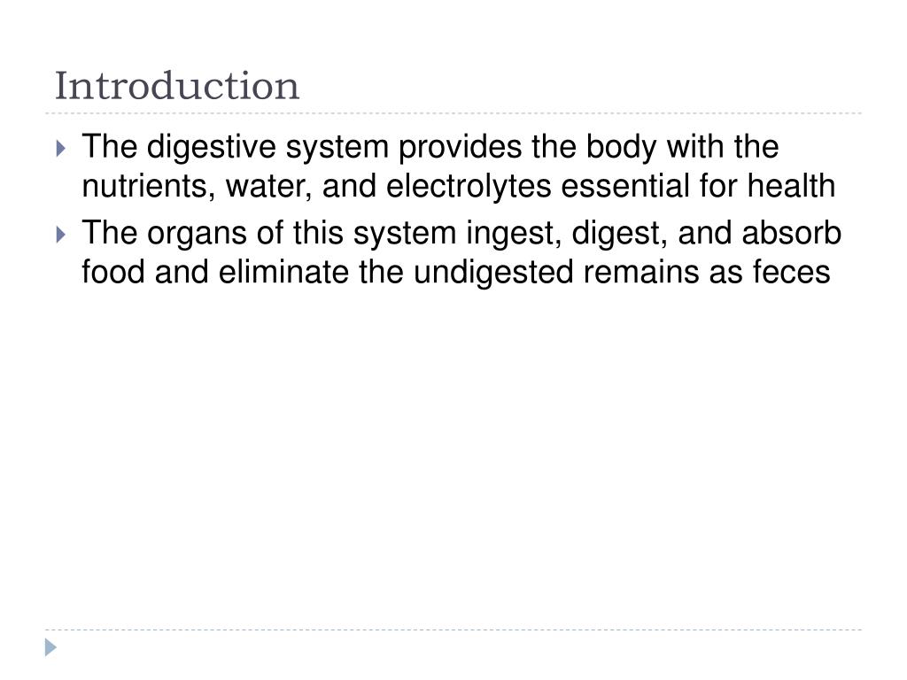 Introduction • The digestive system provides the body with the nutrients, water, and electrolytes essential for health • The organs of this system ingest, digest, and absorb food and eliminate the undigested remains as feces