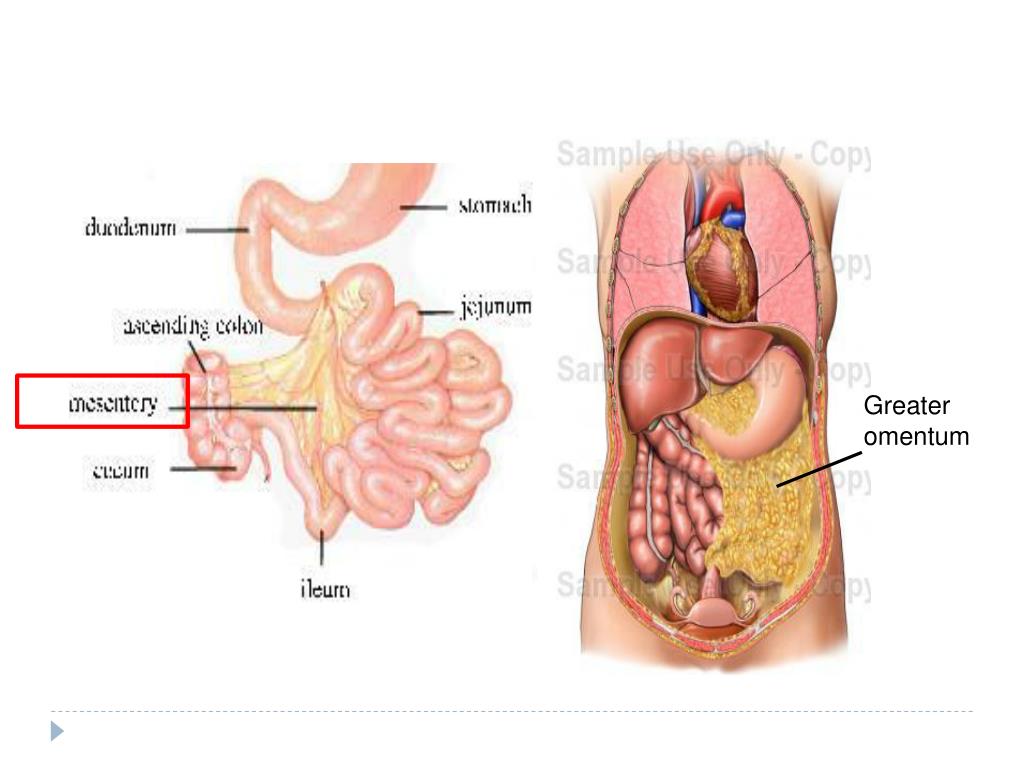 What to know from the pig • Small intestine • Duodenum, jejunum, ileum • Ileocecal valve • Large intestine • Cecum • Rectum (anus) • Greater omentum • Mesentery • Liver • Falciform ligaments • Gallbladder • Pancreas