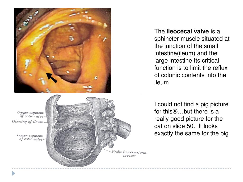 The ileocecal valve is a sphincter muscle situated at the junction of the small intestine(ileum) and the large intestine Its critical function is to limit the reflux of colonic contents into the ileum I could not find a pig picture for this…but there is a really good picture for the cat on slide 50. It looks exactly the same for the pig