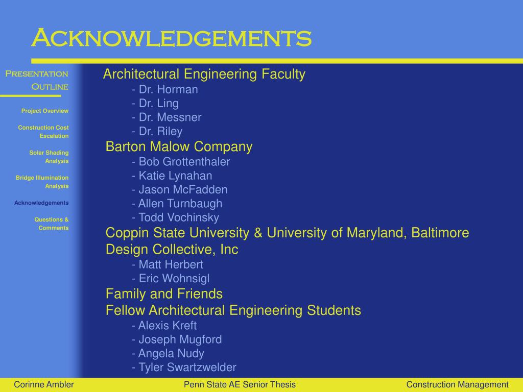 Acknowledgements • Presentation • Architectural Engineering Faculty • - Dr. Horman • - Dr. Ling • - Dr. Messner • - Dr. Riley Barton Malow Company - Bob Grottenthaler - Katie Lynahan - Jason McFadden - Allen Turnbaugh - Todd Vochinsky Coppin State University & University of Maryland, Baltimore Design Collective, Inc - Matt Herbert - Eric Wohnsigl Family and Friends Fellow Architectural Engineering Students - Alexis Kreft - Joseph Mugford - Angela Nudy - Tyler Swartzwelder • Outline • Project Overview • Construction Cost • Escalation • Solar Shading • Analysis • Bridge Illumination • Analysis • Acknowledgements • Questions & • Comments