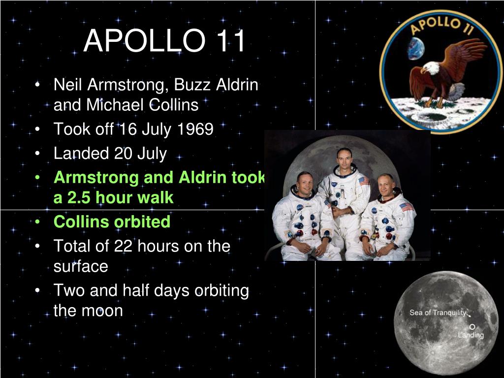 APOLLO 11 • Neil Armstrong, Buzz Aldrin and Michael Collins • Took off 16 July 1969 • Landed 20 July • Armstrong and Aldrin took a 2.5 hour walk • Collins orbited • Total of 22 hours on the surface • Two and half days orbiting the moon